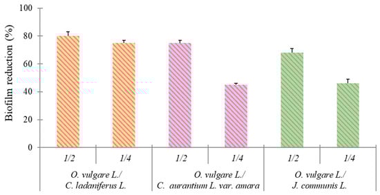 A good inhibition of biofilm formation with the 1/2 synergistic concentration was observed for all combinations. In particular, biofilm reductions of 80% for O. vulgare L./C. ladaniferus L. (corresponding to 0.0039/0.0312% v/v), 75% for O. vulgare L./C. aurantium L. var. amara (corresponding to 0.0039/0.125% v/v), and 68% for O. vulgare L./J. communis L. (corresponding to 0.0039/0.125% v/v) were detected. Interestingly, a good inhibitory effect (75% reduction in biofilm formation) was maintained in the presence of the 1/4 synergistic combination of O. vulgare L./C. ladaniferus L. (corresponding to 0.0019/0.0156%, v/v).
