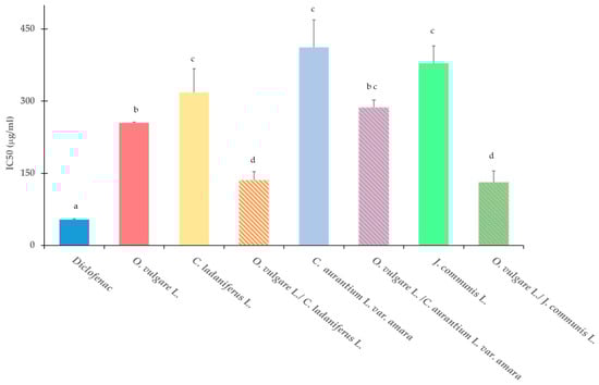 Effect on heat-induced protein denaturation of EOs alone and in combination (1:1), expressed as IC50 (inhibitory concentration 50%). Standard anti-inflammatory drug: diclofenac (sodium salt). Results are expressed as means ± SD of three different experiments. Means with the same letter are not significantly different from each other (p > 0.05).
