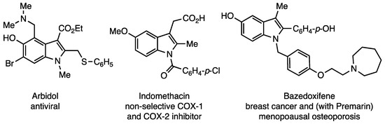 Indoles are well represented in the pantheon of drug molecules, and this has been extensively reviewed [24,25,26]. Several derivatives which exhibit substitution patterns similar to those available by the current method are pictured in Figure 1 below. Arbidol is a broad-spectrum antiviral agent that has demonstrated potential against influenza A, B, and C, respiratory syncytial virus (RSV), herpes simplex, and hepatitis B and C, among others [27]. Indomethacin, a non-selective COX-1 and COX-2 inhibitor, displays potent NSAID activity by blocking the production of prostaglandins, which contribute to painful inflammation caused by arthritis and gout [28]. Finally, Bazedoxifene in combination with Premarin has been approved for the treatment of menopausal osteoporosis and is being further investigated as a possible therapeutic agent to combat breast cancer [29,30].