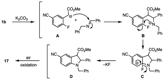 Presumed mechanism for the [3+2] approach to prepare methyl 1-benzyl-2-phenyl-5-cyano-1H-indole-3-carboxylate (17) from 1b.