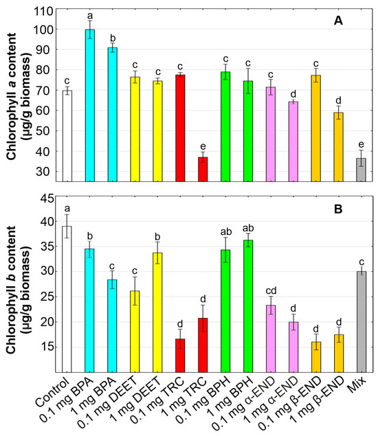 The content of chlorophyll a (A) and b (B) in Wolffia arrhiza cultures under the influence of the following micropollutants: BPA (0.1 and 1 mg/L), DEET (0.1 and 1 mg/L), TRC (0.1 and 1 mg/L), BPH (0.1 and 1 mg/L), α-END (0.1 and 1 mg/L), and β-END (0.1 and 1 mg/L), as well as their mixture, in relation to the control on the 7th day of culture. Data are the means of three independent experiments ± SD. Treatments with at least one letter being the same indicate a non-significant difference according to Tukey’s post hoc test.