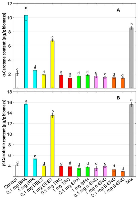 The content of α-carotene (A) and β-carotene (B) in Wolffia arrhiza cultures under the influence of the following micropollutants: BPA (0.1 and 1 mg/L), DEET (0.1 and 1 mg/L), TRC (0.1 and 1 mg/L), BPH (0.1 and 1 mg/L), α-END (0.1 and 1 mg/L), and β-END (0.1 and 1 mg/L), as well as their mixture, in relation to the control on the 7th day of culture. Data are the means of three independent experiments ± SD. Treatments with at least one letter being the same indicate a non-significant difference according to Tukey’s post hoc test.