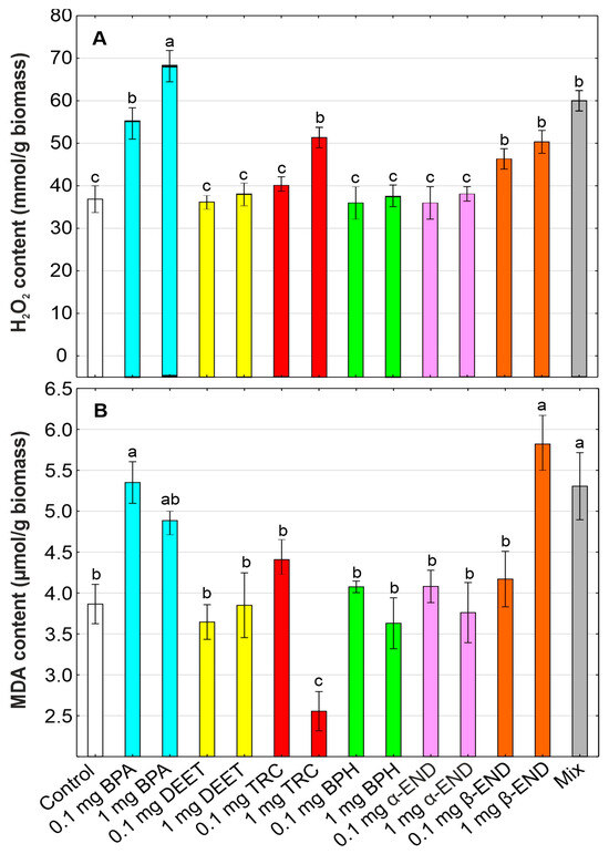 Malondialdehyde (MDA) (A) and hydrogen peroxide (H2O2) (B) contents in Wolffia arrhiza cultures under the influence of the following micropollutants: BPA (0.1 and 1 mg/L), DEET (0.1 and 1 mg/L), TRC (0.1 and 1 mg/L), BPH (0.1 and 1 mg/L), α-END (0.1 and 1 mg/L), and β-END (0.1 and 1 mg/L), as well as their mixture, in relation to the control on the 7th day of culture. Data are the means of three independent experiments ± SD. Treatments with at least one letter being the same indicate a non-significant difference according to Tukey’s post hoc test.