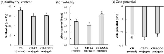Sulfhydryl content (a), turbidity (b), and zeta-potential (c) of chicken muscle protein–polyphenol conjugates. CB, chicken breast powder (as control); CB-TA, chicken breast protein–tannic acid conjugate; CB-EGCG, chicken breast protein–EGCG conjugate. a–c Means with the same letters between treatments are not significantly different (p > 0.05).