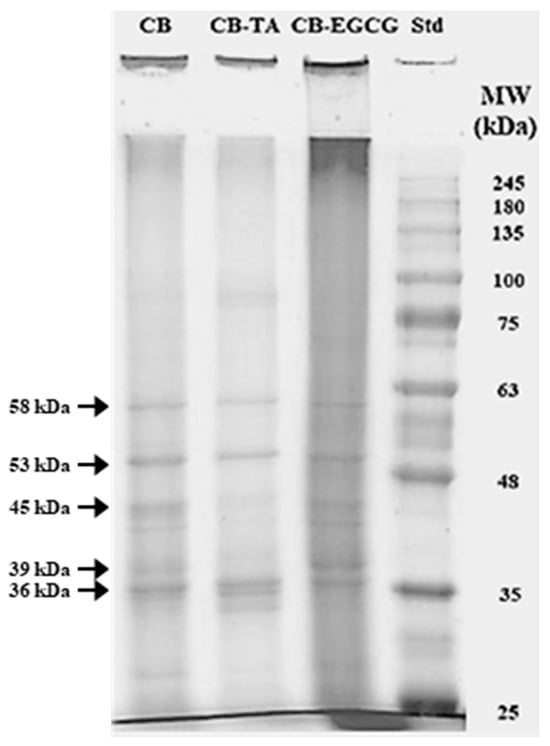 A representative photo of protein SDS-PAGE (5% stacking gel and 8% separating gel) of chicken breast protein–polyphenol conjugates. CB, chicken breast powder (as control); CB-TA, chicken muscle protein–tannic acid conjugate; CB-EGCG, chicken muscle protein–EGCG conjugate; Std, protein standard marker. One hundred micrograms of protein were loaded in each sample.