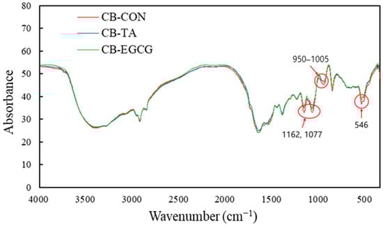 The FTIR spectra of chicken muscle protein–polyphenol conjugates are shown in Figure 3. CB-TA and CB-EGCG conjugates exhibit reduced absorption peaks compared to CB control in the regions around 1162 and 1077 cm−1, as well as between 950 and 1005 cm−1. These reductions indicate effective binding interactions between polyphenols and the protein matrix. The region from 1200 to 900 cm−1 corresponds to decreases in C-O and C-O-C bonds or O-H vibrations, notifying the weakening or rearrangement of existing bonds as a result of protein–polyphenol interactions [23]. A broad absorption band around 3270 cm−1, attributed to O-H stretching vibrations, is observed in all samples. The presence of this band indicates extensive hydrogen bonding and the incorporation of polyphenols can enhance these interactions, potentially improving the hydration and thermal stability of the protein matrix. The amide I and amide II bands of the conjugates appear at approximately 1655 cm−1 and 1550 cm−1, respectively, implying that EGCG induces changes in protein secondary structures through vibrational stretching of protein bonds. These bands correspond to specific frequencies associated with α-helices and β-sheets, overlapping signals reflecting secondary structural changes in polypeptide chains [24]. Such structural modifications are further supported by frequency shifts attributed to secondary structure alterations in polypeptides [25].