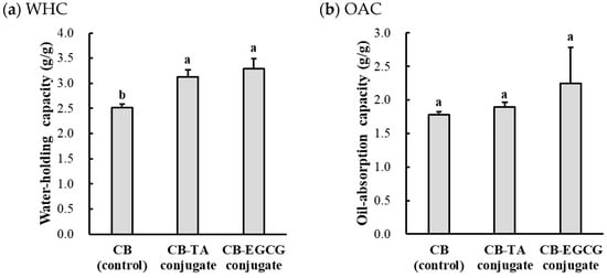When compared to the WHC of the CB control (2.25 g/g), CB-TA and CB-EGCG showed significantly increased WHC of 3.29 g/g and 3.13 g/g, respectively (p < 0.05). The WHC, which reflects the amount of water that protein–polyphenol conjugates can retain without releasing liquid, was significantly higher for CB-TA and CB-EGCG at 3.29 (g/g) and 3.13 (g/g), respectively, compared to the CB control at 2.52 (g/g) (p < 0.05). The increased WHC of the conjugates suggests that polyphenol binding could enhance the hydrophilic behavior of the protein matrix, which may be due to the hydroxyl groups promoting hydrogen bonding with water molecules [26]. These results are consistent with previous findings denoting that polyphenols alter the surface characteristics of proteins, resulting in enhanced water-holding capacity and flexibility [27,28]. Regarding OAC, a numerically increasing trend was observed for chicken muscle protein–polyphenol conjugates, but there was no significant difference.