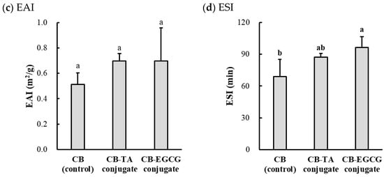 Water-holding capacity (WHC, (a)), oil absorption capacity (OAC, (b)), emulsion activity index (EAI, (c)), and emulsion stability index (ESI, (d)) of chicken breast muscle protein–polyphenol conjugates. CB, chicken breast powder (as control); CB-TA, chicken muscle protein–tannic acid conjugate; CB-EGCG, chicken breast–EGCG conjugate. a–b Means with the same letters between treatments are not significantly different (p > 0.05).