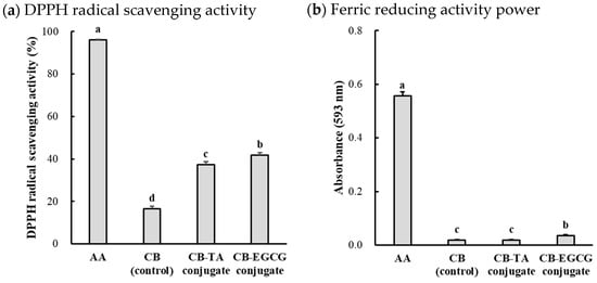 DPPH radical scavenging activity (a) and ferric reducing activity power (FRAP, (b)) of chicken breast protein–polyphenol conjugates. AA, L-ascorbic acid (as positive control); CB, chicken breast powder (as control); CB-TA, chicken muscle protein–tannic acid conjugate; CB-EGCG, chicken muscle protein–EGCG conjugate. a–d Means with the same letters between treatments are not significantly different (p > 0.05).