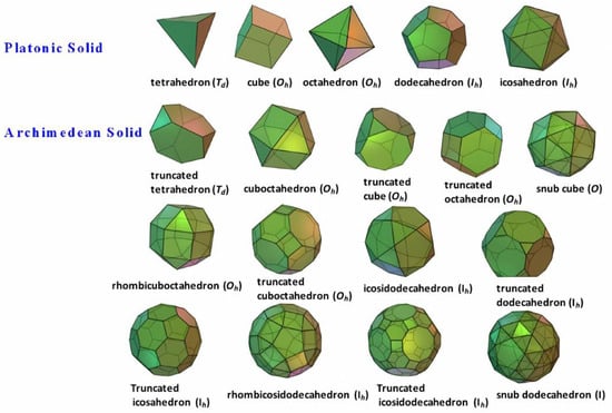 Illustration of five Platonic solids and thirteen Archimedean solids, their corresponding symmetry groups are in parentheses. Reproduced with permission from Pan et al. [8]. Copyright 2017 Elsevier B.V.
