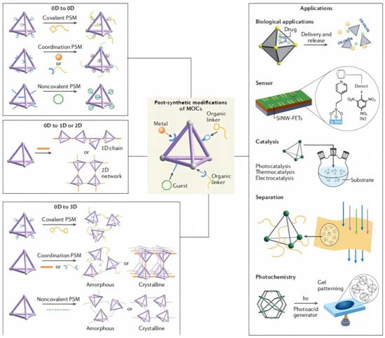 A key factor in the modification of a series of calixarene-protected structures was exposed because they can form tunable and stable vertices necessary for post-synthetic modification (PSM) approaches [43]. This conveniently allowed the group of Chen and Zhang to synthesize advances in the considerations raised in PSM reactions exclusively in pre-assembled MOCs, leaving aside the structural dissociation and reintegration of PSM processes (which as such as are building block exchange ligand/metal reactions); structural transformations instead of post-assembly triggered by various stimuli; and host–guest chemistry inside of the MOCs cavities [44]. On the contrary, they emphasize covalent and coordination modification in terms of PSM structural variation in both the exterior and interior; nevertheless, noncovalent strategies center only on exterior PSMs. Another important characteristic that the authors discuss is post-modified products; in this regard, they make a relevant division of 0D cages to 0D cages; 0D cages to one-dimensional (1D) or two-dimensional (2D) structures; 0D cages to three-dimensional (3D) network materials [44], as exemplified in Figure 5. It has even been suggested that the use of pristine, post-synthetically modified MOFs to generate catalysts for polycarbonate (PC) depolymerization by methanolysis reaction is possible [45].