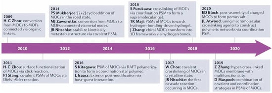 The chronological development in post-synthetic modifications of metal–organic cages with representative examples. MOCs, metal–organic cages; MOFs, metal–organic frameworks; PSM, post-synthetic modifications; RAFT, reversible addition–fragmentation chain transfer. Reproduced with permission from Liu et al. [44]. Copyright 2022 Springer Nature Limited.