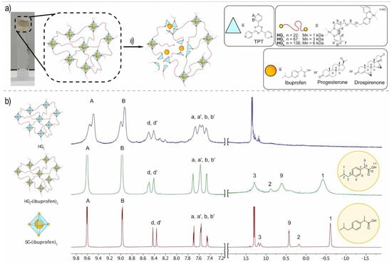 (a) Formation of metal–organic cage-crosslinked polymer hydrogels by terminal functionalization of PEG with bipyridine ligands, with hydrogels formed from the corresponding palladium nitrate precursors in combination with 2,4,6-tri(4-pyridyl)-1,3,5-triazine (TPT); (b) 1H NMR (600 MHz, D2O) of hydrogels HG3 without a guest (top), hydrogel HG3 (ibuprofen)2 encapsulating two ibuprofen moieties (middle) and SC· (ibuprofen)2. Reproduced with permission from Küng et al. [68]. Copyright 2023 Wiley-VCH GmbH.
