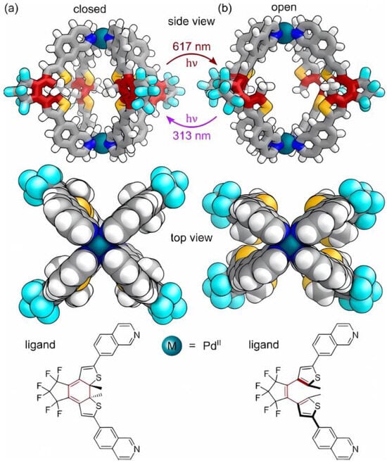 The properties of the open and closed forms’ structures are evidently as special as the presence of chiral guests influencing the enantioselectivity and the structural opening and closing. Not only do the open and closed forms have different guest-binding properties, but the presence of chiral guests can also influence the enantioselectivity of the ring’s open and closure switching [76]. There have been developments in light-promoted photoswitchable MOC structures, whose architecture is organized with dithienylethylene units undergoing reversible forms of interconversion, i.e., closed and open forms, as illustratively described in Figure 10a,b.