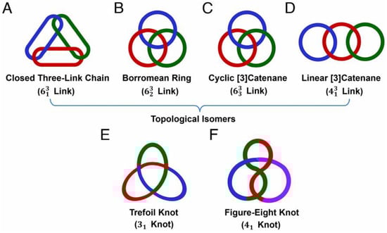 For Jin and his team [84], the construction of non-trivial mechanically interlocked molecules (MIMs) has also been inherent and attractive. They have consequently outlined the molecular construction of closed three-link chains ( links) (Figure 11A), for instance, the construction of [3]catenane with six molecular linkages. They detail that since synthesis from three rings is extremely difficult and the probability remains during the self-assembly process that alternative topological isomers, such as links (Figure 11B), cyclic [3]catenanes ( links) (Figure 11C), and linear [3]catenanes ( links) (Figure 11D) and other included topologies, will arise. Among the knotted molecules, unlike the faster-growing trefoil knots (Figure 11E), the performance of figure-eight knots ( knots, single strand with four crossings) (Figure 11F) is inauspicious.