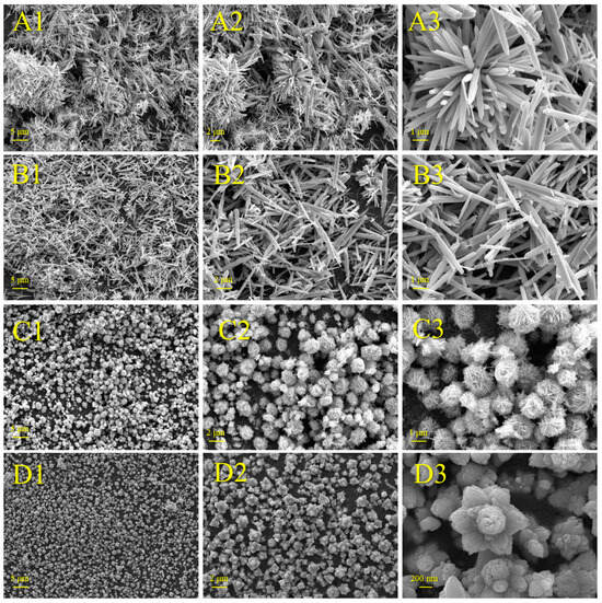 Scanning electron microscopy (SEM) images revealing the morphological diversity of ZnO NPs influenced by citric acid concentration: (A) hexagonal prism structure of USZ-0 (A1, A2 and A3 are low, medium and high magnification respectively); (B) chrysanthemum-like flower structure of USZ-0.1 (B1, B2 and B3 are low, medium and high magnification respectively); (C) self-assembled nanosheet petals of USZ-0.5 (C1, C2 and C3 are low, medium and high magnification respectively); (D) conical petal arrangement of USZ-1 (D1, D2 and D3 are low, medium and high magnification respectively).