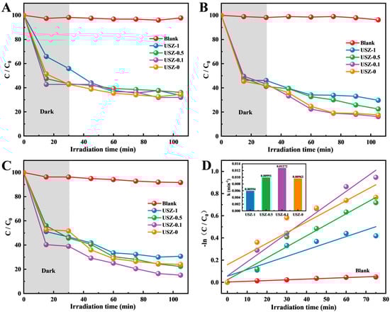 The degradation efficacy of USZ-x catalysts on malachite green (MG) solutions under various lighting conditions: (A) visible light, (B) ultraviolet (UV) light, and (C) simulated sunlight. (D) Photocatalytic degradation kinetic curves of MG solution catalyzed by USZ-x particles under simulated sunlight. The treatment in the absence of ZnO NPs served as the blank control group.