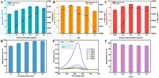 Optimization of photocatalytic conditions for USZ-0.1 in the degradation of malachite green (MG) under sunlight irradiation: (A) Influence of initial MG concentration; (B) effect of solution pH; (C) impact of photocatalyst dosage. (D) Degradation rate and (E) UV–vis absorption spectra of MG solution at various time intervals under the optimized experimental conditions: [MG]0 = 20 μg/mL, pH = 5, [USZ-0.1] = 0.2 mg/mL. (F) Recycling efficiency assessment of USZ-0.1 in the photocatalytic degradation of MG.