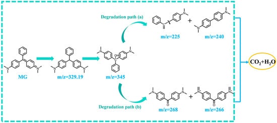These reactive radicals, OH· and O2⋅−, are the principal agents in the oxidative breakdown of MG. As illustrated in Figure 5, the primary metabolite of MG, leucomalachite green [35], with a mass-to-charge ratio (m/z) of 329.19, is attacked by OH· radicals, leading to the formation of tri-phenyl methanol (m/z = 345). This intermediate can follow two distinct decay pathways: Pathway (a) results in the formation of a benzophenone intermediate (m/z = 225) and 4,4′-dimethyl-amino biphenyl (m/z = 240), while Pathway (b) yields two benzophenone derivatives (m/z = 268 and 266) [36,37]. Ultimately, these intermediates are completely mineralized into carbon dioxide (CO2) and water (H2O) [38], as described in Equation (5). It is important to note that while the intermediate products, such as m/z 268 and m/z 266, were not directly detected in our reaction mixture using mass spectrometry (MS), their presence was inferred on the basis of the established photocatalytic degradation pathways of malachite green (MG) reported in the literature [35,36,37]. Our experimental observations, which include the gradual weakening of the characteristic absorption peaks of MG, are consistent with the effective degradation of MG and support the plausibility of these intermediate products. The degradation pathways proposed in our study are thus based on a combination of literature-supported mechanisms and experimental evidence, providing a reasonable explanation for the observed photocatalytic degradation process.