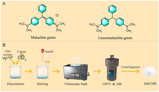(A) Chemical structural formulae of malachite green (MG) and leucomalachite green; (B) flow chart of ultrasound-assisted and citric acid-guided synthesis of zinc oxide nanoparticles (ZnO NPs).