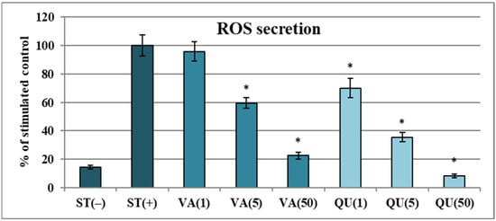 The effect of vanillic acid (VA) at concentrations of 1–50 µg/mL on ROS production by fMLP-stimulated neutrophils [%]. The presented data are means ± SD of three independent experiments performed with cells isolated from five independent donors. Positive control: quercetin (QU) at 1–50 µg/mL. Statistical significance of differences (*) was established by ANOVA with a post hoc Dunnett’s test, with * p < 0.05 compared with the stimulated control.