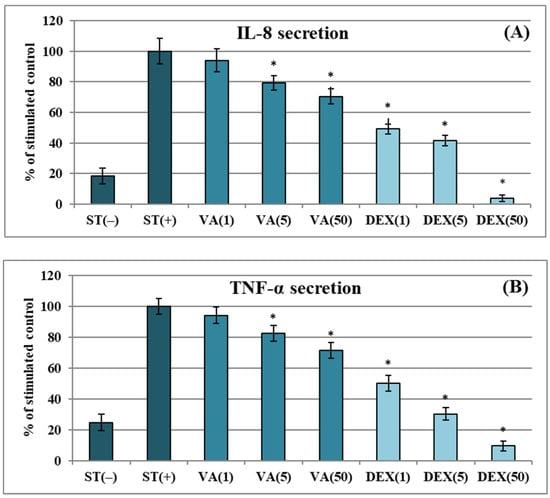 The effect of vanillic acid (VA) at concentrations of 1–50 µg/mL on: (A) IL-8 and (B) TNF-α secretion by LPS-stimulated neutrophils [%]. Data are mean values ± SD of three independent experiments performed with cells isolated from five independent donors. Positive control: dexamethasone (DEX) at 1–50 µg/mL. Statistical significance of differences (*) was established by ANOVA with post hoc Dunnett’s test, with * p < 0.05 compared with the stimulated control.