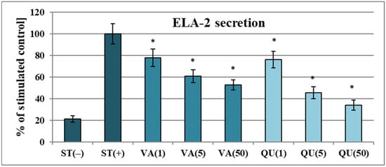The effect of vanillic acid (VA) at concentrations of 1–50 µg/mL on ELA-2 secretion by fMLP+cytochalasin B-stimulated neutrophils [%]. Data are presented as means ± SD of three independent experiments performed with cells isolated from five independent donors. Positive control: quercetin (QU) at 1–50 µg/mL. Statistical significance in Dunnett’s test: * p < 0.05 compared with the stimulated control.