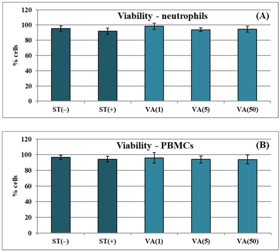The effect of vanillic acid (VA) at 1–50 µg/mL on membrane integrity of immune cells expressed as a percentage of propidium iodide-negative cells: (A) influence on viability of neutrophils after 24 h incubation; (B) influence on viability of PBMCs after 48 h incubation. Data are expressed as means ± SD of five independent tests performed with cells isolated from five independent donors. Statistical significance in Dunnett’s test: p > 0.05 compared with the stimulated control.