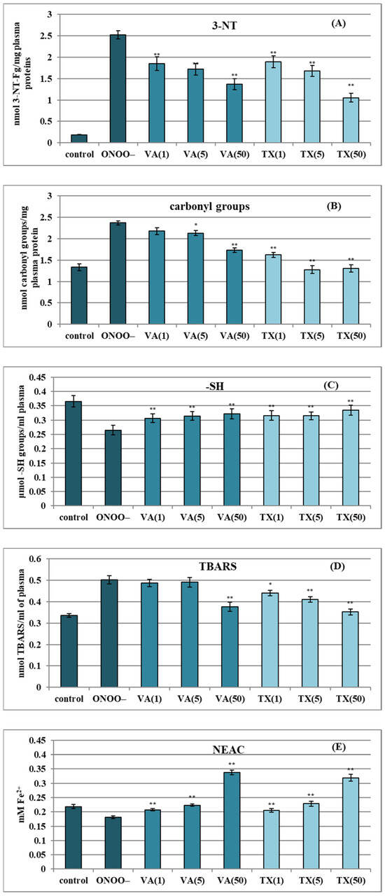 For the tests, plasma samples were pre-incubated for 15 min at 37 °C with VA or positive control (Trolox®, TX, Sigma-Aldrich, St. Louis, MO, USA) and then treated with ONOO− (100–150 μM). Two kinds of control plasma were also prepared; the first was exposed to ONOO− without the analytes, and the second was the blind control containing neither analytes nor ONOO−. The protective effect of the tested analytes on human plasma components under the conditions of oxidative stress induced by ONOO− was verified spectro/fluorimetrically and immunoenzymatically, as previously described [53,54,55]. In brief, the non-enzymatic antioxidant capacity (NEAC) of plasma was measured in the FRAP assay, based on the reducing ferric ions (Fe3+) into ferrous ions (Fe2+); the results were expressed in mM of Fe2+ equivalents. A competitive ELISA test was applied to the immunodetection of 3-nitrotyrosine (3-NT). All results from this assay were expressed as equivalents of a 3-nitrotyrosine-containing protein standard (nitrated fibrinogen, 3-NT-FG) per mg of blood plasma protein. The concentration of free thiol (-SH) groups in plasma was measured spectrophotometrically using Ellman’s reagent and expressed in µmol/mL of plasma. The peroxidation of plasma lipids was assayed using thiobarbituric acid-reactive substances (TBARS), calculated in nmol/mL of plasma.