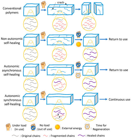 6]. Self-healing polymeric materials are among the most extensively researched self-healing materials. The vast design space of polymeric systems allows considerable freedom in selecting chemistries, compositions, chain topologies, and microstructures to promote regeneration [