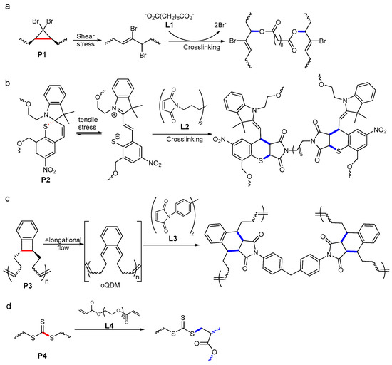 44]. Sonicating semi-dilute solutions of P3 gradually increased the average size of the dissolved polymer, in contrast to the expected reduction in the chain length observed at lower polymer concentrations. The increase was attributed to the dimerization of oQDM moieties on different chains, but no information about chain topology was reported. The average size plateaued at ~3 times that of the intact polymer, potentially indicating a steady state in which the rate of mechanochemical chain fracture matched the rate of chain additions. Repeating sonication in the presence of bismaleimide, L3, caused rapid gelation, presumably by the DA addition of maleimide to oQDM. The low solubility of L3 may contribute to this rapid gelation, complicating inferences about which of the two sequential steps (mechanochemical isomerization vs. additions of unloaded reactants) is rate-determining [