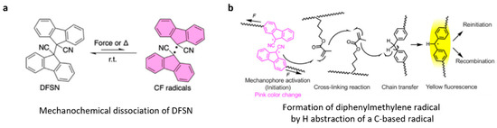 51]. The effect was attributed to crosslinking by radical oligomerization of pendant acrylates initiated by cyanofluorene radicals from mechanochemical backbone fractures by dissociation of DFSN moieties (