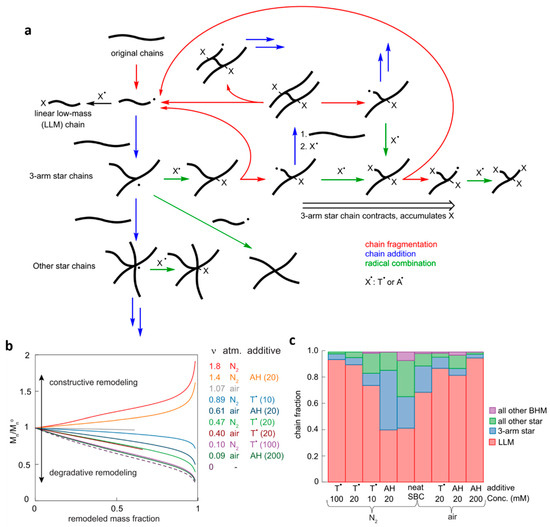 Figure 8b). Below-unity values of ν signify the net loss of load-bearing bonds, i.e., material degradation, whereas ν > 1 corresponds to self-strengthening. Despite larger branched chains being formed under all studied conditions, the measured values of ν varied from 1.8 (effective self-strengthening) in neat SBC sheared under N