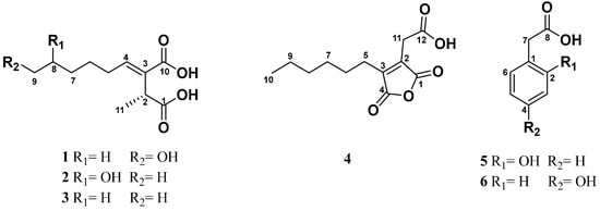 The fractionation of the extract from the culture broth of strain HYP6 fermented in the malt liquid medium led to the isolation and structure elucidation of two unreported piliformic derivatives, (+)-9-hydroxypiliformic acid (1) and (+)-8-hydroxypiliformic acid (2), together with the previously described (+)-piliformic acid (3), the major metabolite of the extract; hexylaconitic acid A anhydride (4); 2-hydroxyphenylacetic acid (5); and 4-hydroxyphenylacetic acid (6) (Figure 2).