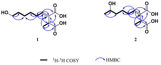 Compound 1 was isolated from a colorless oil. Its molecular formula was determined as C11H18O5 by (+)-HRESIMS at m/z 253.1059 [M + Na]+ (calcd. for C11H18O5Na, 253.1052), indicating three degrees of unsaturation. The IR spectrum showed absorption bands at vmax 3355 (OH), 1689 (conjugated COOH), and 1637 (C=C) cm−1 (Figure S8). The 1H NMR spectrum (Table 1 and Figure S1) displayed signals of one methyl doublet at δH 1.31 (d, J = 7.1 Hz, H-11) coupled with the signal of a proton at δH 3.63 (dq, J = 7.1 Hz, H-2), and one olefinic proton at δH 6.82 (t, J = 7.6 Hz). Other signals observed were multiplets attributed to the protons of three overlapped methylenes of an aliphatic chain at δH 1.42–1.66 and a signal at δH 3.55 (t, J = 6.6 Hz, H-9), which was consistent with the presence of a hydroxymethylene group in the molecule. Analysis of the 13C NMR (Table 1 and Figure S2) data, in combination with the gHSQC spectrum (Figure S4), revealed the presence of eleven carbon signals, which could be assigned to two carbonyl groups at δC 178.0 (C-1) and 170.3 (C-10), two olefinic carbons at δC 134.5 (C-3) and 144.7 (C-4) of a trisubstituted double bond, one oxygenated methylene sp3 at δC 62.8 (C-9), one methine sp3 at δC 39.0 (C-2), one methyl at δC 16.4 (C-11), and four methylene sp3 carbons at δC 29.4 (C-5), 29.6 (C-6), 26.7 (C-7), and 33.4 (C-8). The 1H-1H COSY NMR spectrum of 1 (Figure 3 and Figure S3) showed coupling between the H-2 and H-11, and also established a partial structure from the olefinic proton at δ 6.85 (H-4) along with an aliphatic chain with a spin system of the methylene protons H-5/H-6/H-7/H-8/H-9.