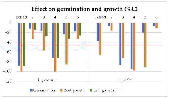 Phytotoxic effects of the extract (EtOAc, 0.4 mg/mL) and compounds (2–6, 0.2 mg/mL) on Lolium perenne and Lactuca sativa. Bars longer than the −50% threshold (red line) are significantly different from the control (p < 0.05, Mann–Whitney U test).