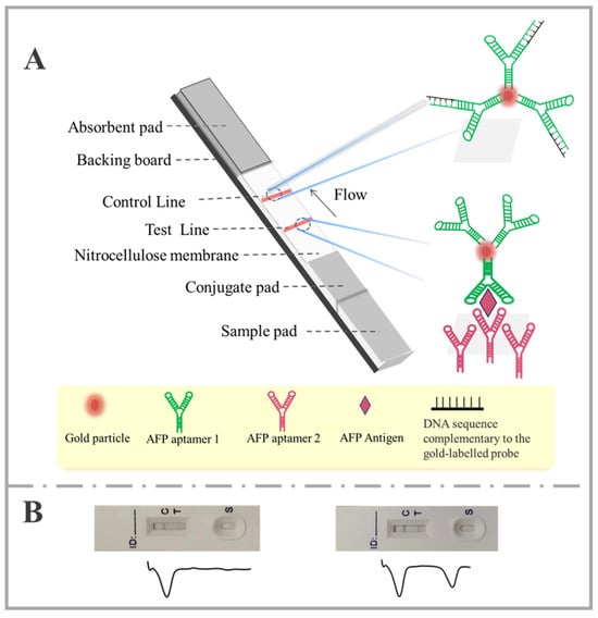 Nucleic acid aptamers are a class of oligonucleotide molecules that exhibit high affinity and strict specificity for target molecules []. These were distinguished using the Exponential Enrichment Ligand System Evolution (SELEX) method, which involves screening artificially constructed oligonucleotide libraries []. The aptamer is maneuverable, reproducible, easy to immobilize and regenerate, and shows consistency across different batches. It has seen widespread applications in sensor technology. Huang et al. reported a SELEX/microfluidic chip method to screen an AFP-specific aptamer []. Dong et al. discovered an AFP-specific single-stranded DNA aptamer, AP273, through the SELEX process combined with capillary electrophoresis []. A variety of aptamer-based biosensors have been designed for AFP detection, employing methods like Raman spectroscopy, dual-polarization interferometry, resonance light scattering, fluorescence, chemiluminescence, cyclic voltammetry, electrochemical impedance, and the giant magneto-resistive technique []. However, those reported aptamer-based biosensors for the detecting of AFP require multiple incubation and washing steps, expensive instruments, and skilled personnel, which limit its applications in point-of-care testing []. In this paper, we report a lateral flow aptasensor for the qualitative (visual) detection of AFP in 10 min. It is the first report of an antibody-free lateral flow assay using aptamers as recognition probes for the detection of AFP. The biosensor was successfully applied for the detection of AFP in human whole serum samples with satisfactory results.