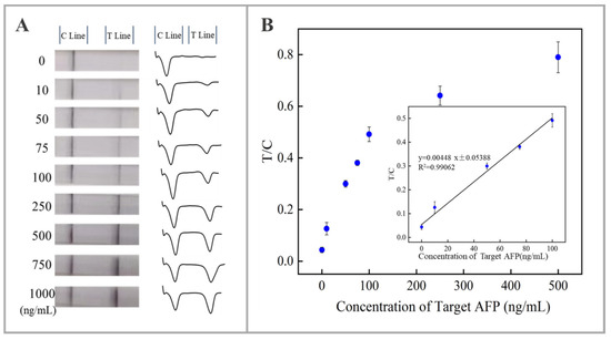 The analytical performance of the aptamer-based lateral flow biosensor was evaluated by testing different AFP concentrations under the optimal experimental parameters. Figure 2A presents the photo images and the corresponding optical responses of the tested strips for the detection of different concentrations of AFP. One can see the captured AuNPs aggregated in the test area, forming visible bands for qualitative analysis. The density of the test bands increases with the increase in AFP concentration. The control group, which served as the blank experimental group, had an AFP concentration of 0 ng/mL. The test region of the control group exhibited no discernible color band, indicating that non-specific adsorption was not a significant phenomenon under the optimized experimental conditions. It is noted that even at an AFP concentration of only 10 ng/mL, a weak detection band could still be discerned.