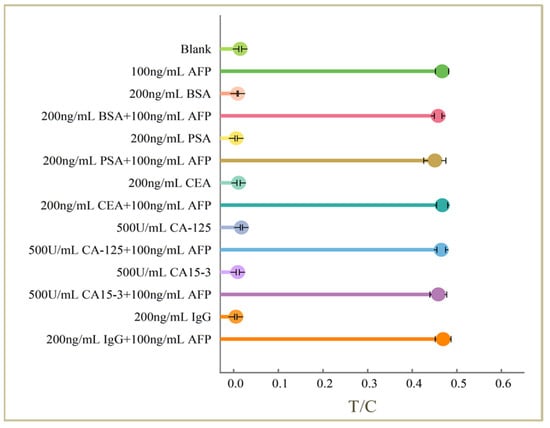 In order to evaluate the specificity of the lateral flow aptasensor for AFP detection, a series of high concentrations of proteins including bovine serum albumin (BSA), prostate cancer antigen (PSA), carcinoembryonic antigen (CEA), ovarian cancer-associated antigen (CA-125), breast cancer-associated antigen (CA15-3), and immunoglobulin G (IgG) were selected for validation. Figure 3 presents the results of specificity tests. The pictures taken during the experiment and the corresponding optical responses can be found in Figure S4 of Supplementary Materials. One can see that negligible response was obtained in the presence of the selected proteins at high concentration. In addition, we measured the responses of the mixture of AFP and the selected proteins on the lateral flow aptasensor. AFP with a final concentration of 100 ng/mL was prepared by spiking AFP to each of the selected protein. It can be seen that there is no significant difference of the response in the presence and absence of the selected proteins, indicating the lateral flow aptasensor had good specificity.