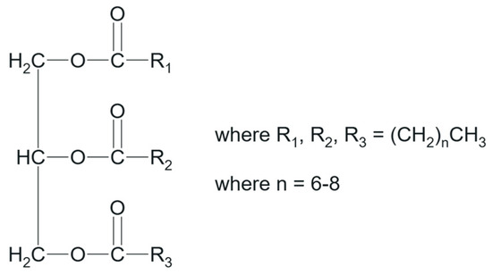 Nowadays, ELSD efficiently translates the necessity of having a “universal detection technique”, where the main requirement for the analyte is to be at least semi-volatile [19]. Granted the detector’s capability of identifying many different species, the method development for the quantification of MCTs contained in Labrafac should aim to sufficiently separate the different esters mixtures of caprylic (C8) and capric (C10) acids, and thus provide knowledge around the conformation and stability of the NE. Effectively, the procedure needs to target four distinct combinations of C8 and C10 [20]. An exemplary structure of Labrafac is given below in Figure 1.