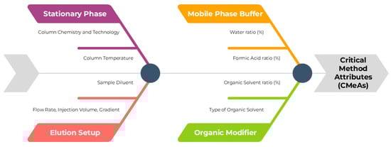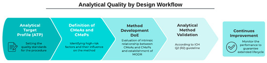 The AQbD workflow comprises multiple steps that align with the recently updated USP <1220> chapter and ICH Q14 revisions [30,33]. Correct execution of the AQbD process guarantees the extension of the analytical procedure lifecycle, a fundamental characteristic that confirms the method’s robustness and reliability [34]. A summary of the steps involved in the AQbD development is provided in Figure 2.