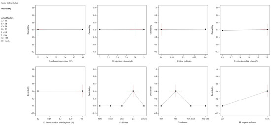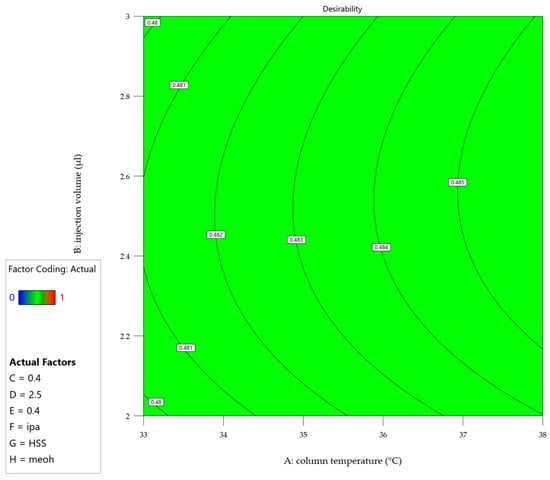 Contour plot of the desirability for the final factor settings according to the legend. Factor coding: A = column temperature (°C), B = injection volume (µl), C = flow (ml/min), D = water amount in mobile phase (%), E = formic acid amount in mobile phase (%), F = diluent, G = column, H = organic solvent.