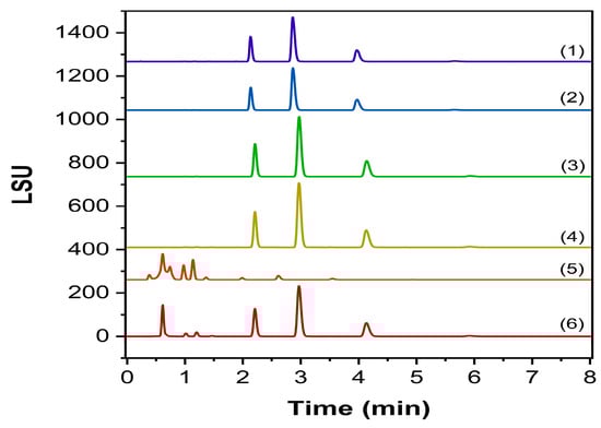 The specificity of an analytical method is its ability to unequivocally obtain a signal free of any interferences brought by other components, such as different active ingredients, degradation products, or matrix species [28,48]. Unlike photodiode array detectors (PDA) with peak purity functionality, ELSD detectors lack the capability of identifying co-eluting species at the same retention time. Therefore, specificity was assessed by comparing signals from standard injections with those from mobile phase, blank, and matrix formulation component injections.
