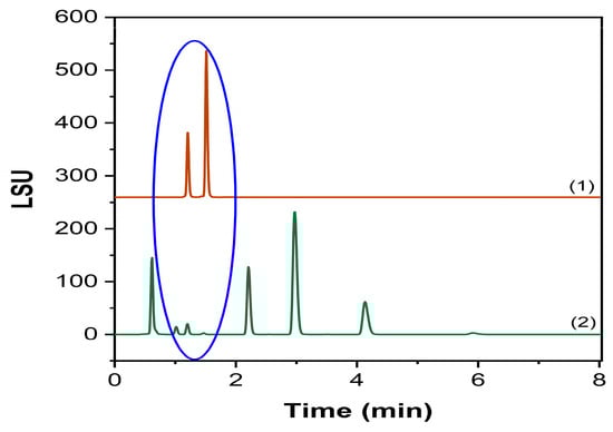 Comparison of Mono- and Diglycerides chromatograms. (1) Mono- and Diglycerides standard injection, (2) acidic stress condition. The blue circle identifies the same RT region.