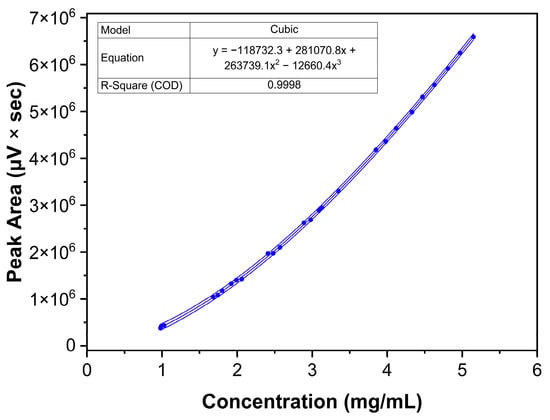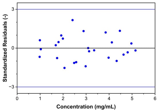 Nine solutions appropriately distributed in the method’s working range were prepared in triplicate by weighing independent amounts of Labrafac and dissolving them in the chosen diluent. The method proved a non-linear response with a 3rd-order cubic fit in the range of 1.0 and 5.0 mg/mL and a correlation coefficient R2 = 0.9998, and the combined response plots are shown in Figure 10. Furthermore, the analysis of standardized residuals against predicted values from the regression model did not present apparent outliers or points of influence, as shown in Figure 11. The normal distribution of the standardized residuals was verified using the Shapiro-Wilk test (p = 0.821) [44].