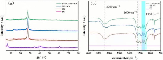(a) XRD patterns of TC, CN, 200-CN, and 1-TC/200-CN; (b) FT-IR spectra of TC, CN, 200-CN, and 1-TC/200-CN.