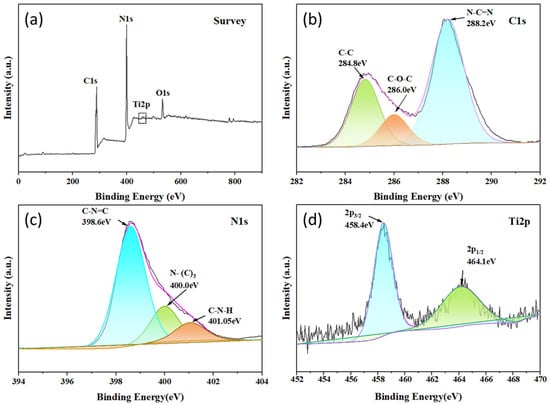 The chemical element composition on the surface of the composite material was investigated using X-ray Photoelectron Spectroscopy (XPS). As shown in Figure 2a, the survey spectrum of 1-TC/200-CN revealed the presence of C, N, Ti, and O elements in the composite, where the O element may originate from oxygen in air or water. In Figure 2b, the C 1s spectrum of the composite exhibited three peaks located at 284.8 eV, 286.0 eV, and 288.2 eV, which were attributed to the C-C, C-O-C, and N-C=N bonds in CN, respectively [46,47,48]. As depicted in Figure 2c, the N 1s XPS spectrum showed three peaks at 398.6 eV, 400.0 eV, and 401.05 eV, corresponding to the C-N=C, N-(C)3, and C-N-H bonds, respectively [49,50]. As illustrated in Figure 2d, the Ti 2p spectrum can be divided into two peaks, with the binding energy of Ti 2p3/2 centered at 458.4 eV and that of Ti 2p1/2 at 464.1 eV [51]. The binding energies of the 1-TC/200-CN nanocomposite originated from both CN and TC, further confirming the successful preparation of the composite material.