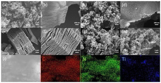 SEM images of CN (a,b), 200-CN (c,d), TC (e,f), and 1-TC/200-CN (g,h); (i) EDS mapping images of C, N, and Ti elements in 1-TC/200-CN.