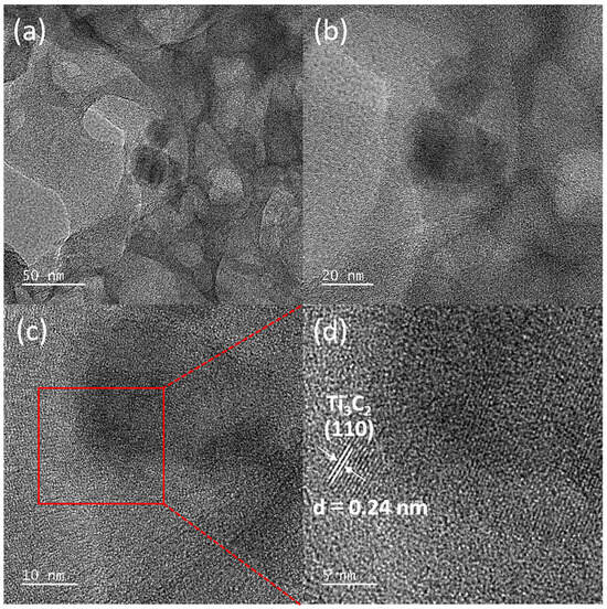 Additionally, Transmission Electron Microscopy (TEM) and High-Resolution Transmission Electron Microscopy (HR-TEM) analyses were conducted on the 1-TC/200-CN composite, further elucidating the typical 2D/2D stacked nanosheet morphology of the synthesized composite. As shown in TEM images (Figure 4a,b), the composite consists of two layered nanomaterials, with the brighter regions corresponding to 200-CN and the darker regions to 1-TC, suggesting a close interface between 200-CN and 1-TC [52]. HR-TEM images (Figure 4c,d) provided more detailed insights, revealing a lattice spacing of 0.24 nm attributable to the (110) plane of 1-TC, while the amorphous regions correspond to 200-CN. This reaffirmed the successful preparation of the 2D/2D 1-TC/200-CN nanosheet composite [41] and was consistent with the results obtained from XRD and SEM.