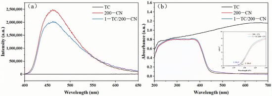 (a) PL emission spectra of TC, 200-CN, and 1-TC/200-CN; (b) DRS spectra of TC, 200-CN, and 1-TC/200-CN.